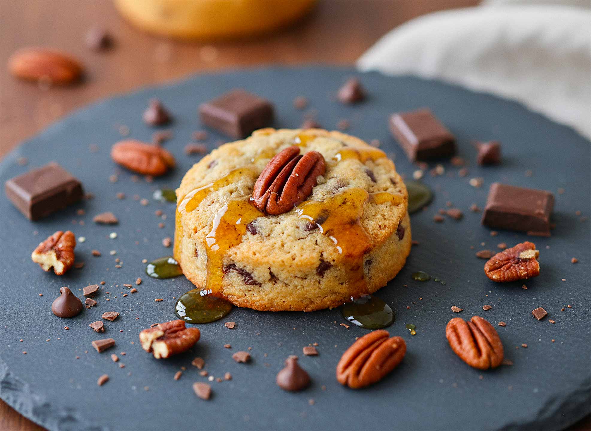Base fondante sirop d’érable, des pépites de chocolat au lait et du croquant par les noix de pécan.