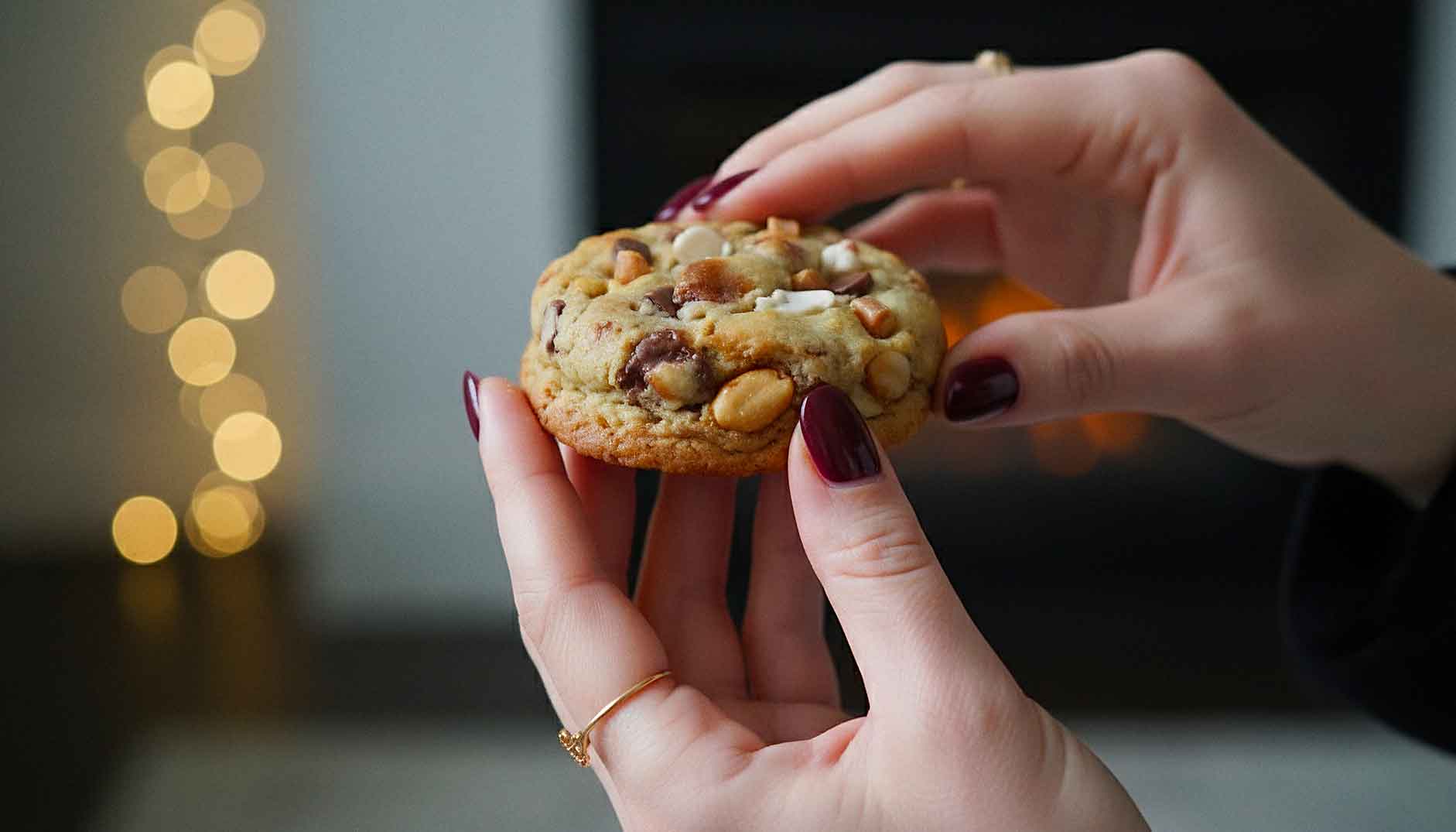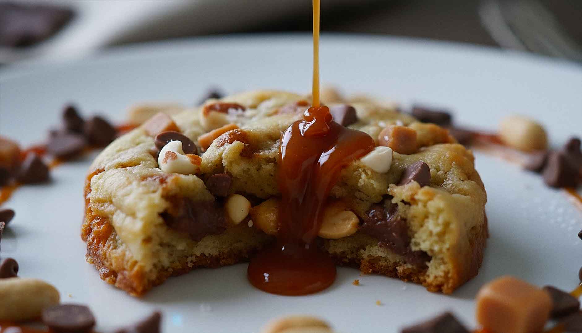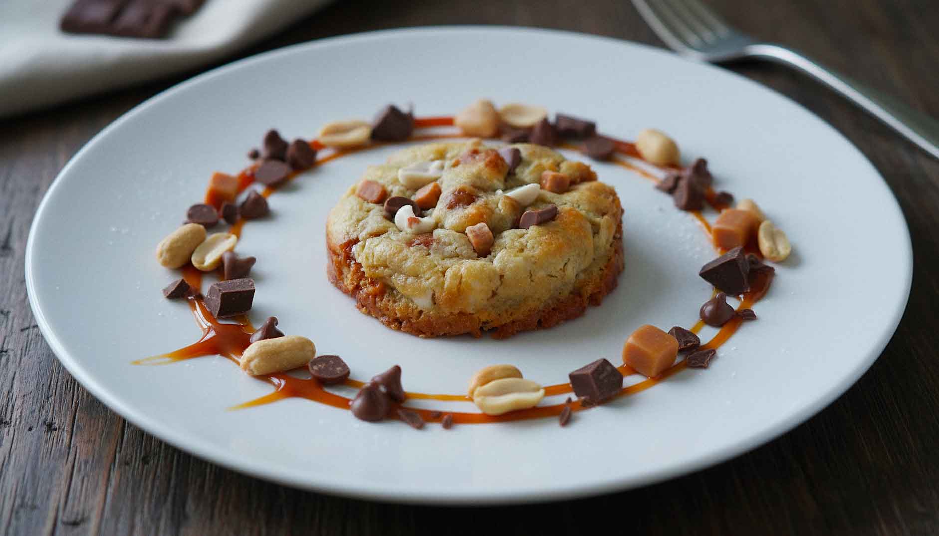 Un cookie dense et moelleux, ponctué de pépites de chocolat au lait fondantes, d’éclats de caramel craquants et de cacahuètes grillées. En son centre, un cœur coulant à la cacahuète qui déborde de gourmandise. En bouche, c’est un jeu de textures parfaitement maîtrisé : fondant, croquant, onctueux. L’équilibre parfait entre le sucre, la pointe de sel et la richesse des oléagineux.