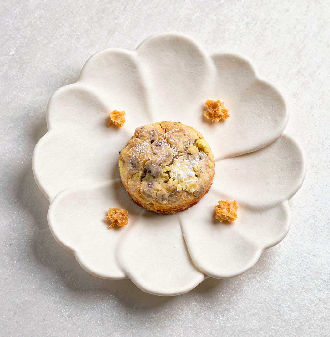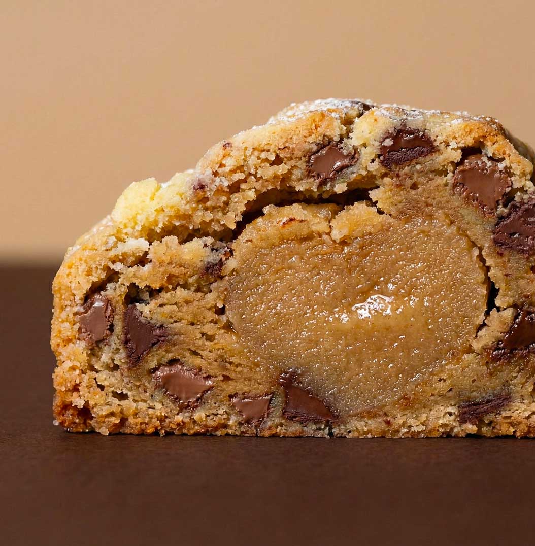 Sous une fine croûte dorée aux pépites de chocolat au lait, se cache un cœur fondant à la pâte d’amande. L’attaque est douce, presque onctueuse, puis la gourmandise s’installe, enveloppante, subtilement sucrée. La pâte d’amande apporte une texture moelleuse unique et une richesse qui contraste avec la douceur lactée du chocolat.